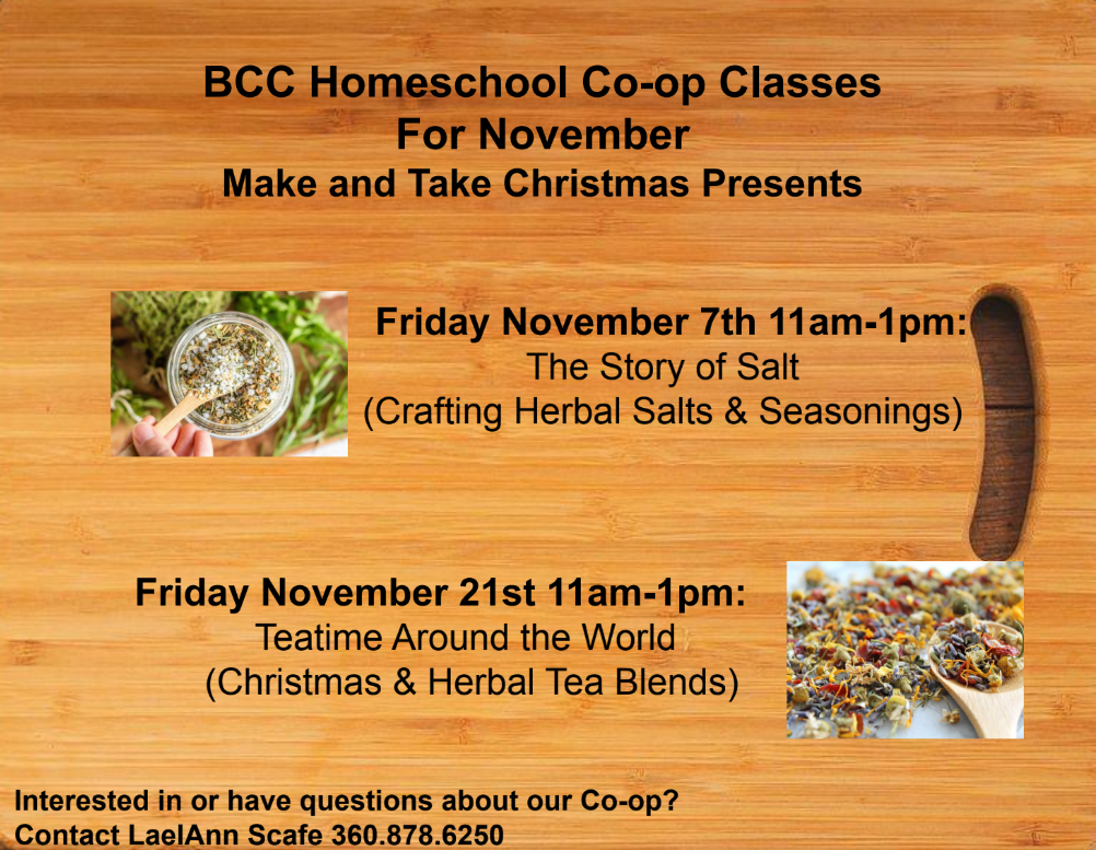 Home School Co-op group meets at BCC twice a month. See Lael Ann for details or questions.